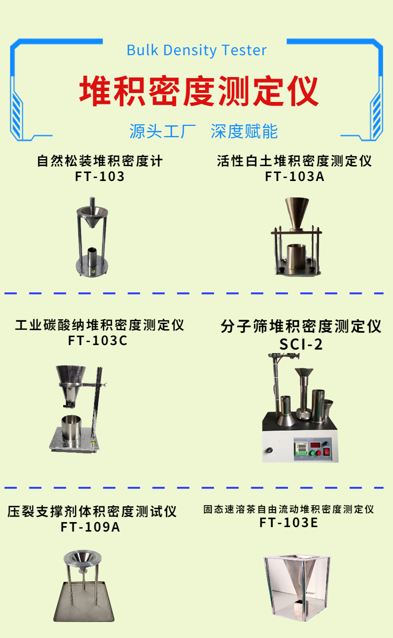堆積密度測量是嚴格的,在不同的粉體測量時,對堆積密度儀的要求也是不同的,如上圖所示都可以使用