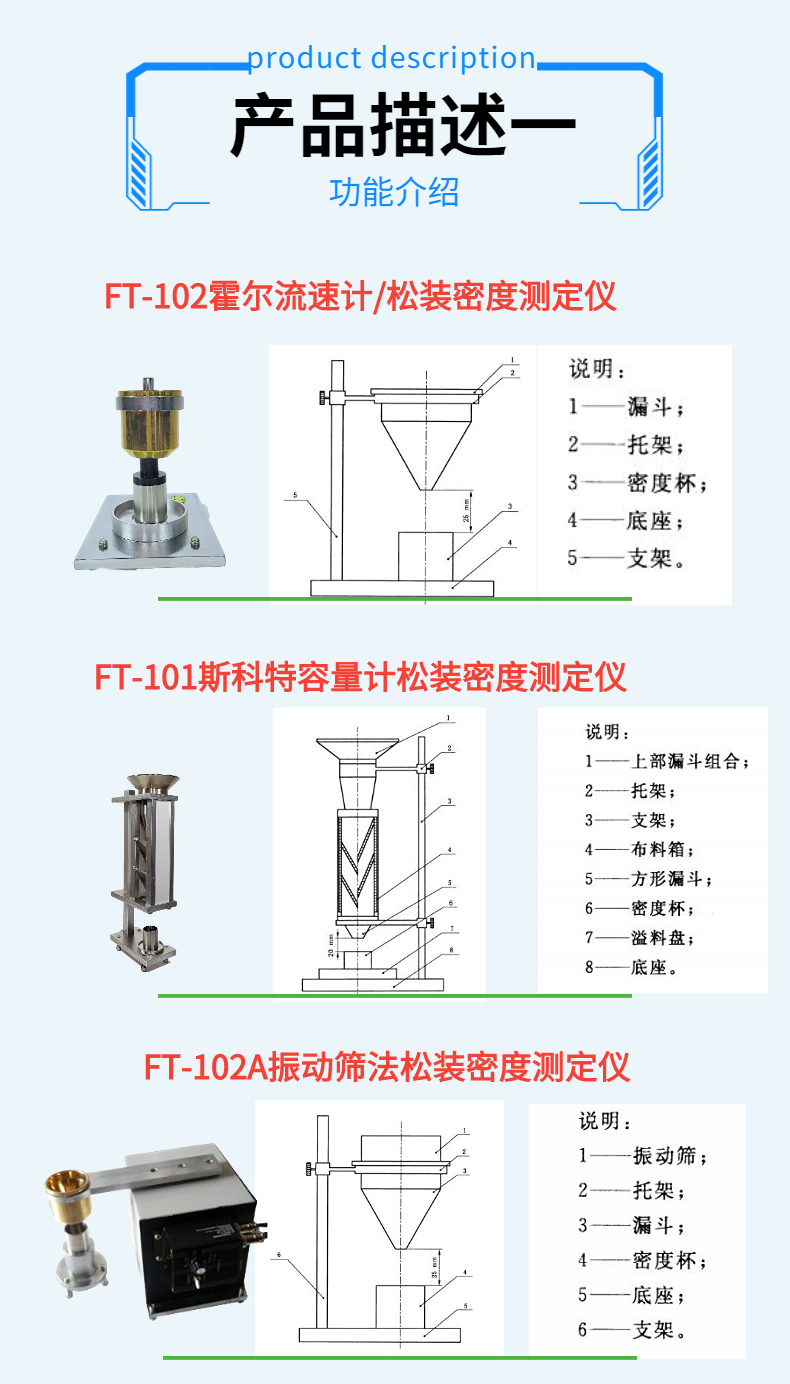 松裝密度測定儀標準漏斗法:描述的是容易流動的樣品,比如能否自然流出2.5mm和5.0mm 漏斗孔徑,常用于金屬粉末,陶瓷粉末測量,這些粉末的流動性基本能達到容易流的狀態.