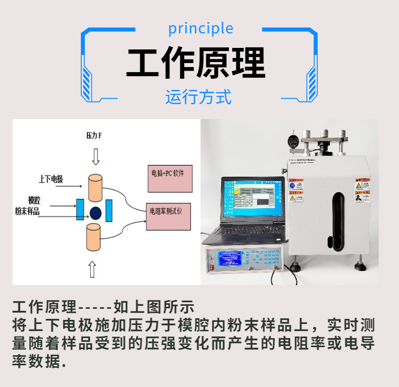 粉末電阻率測試儀的工作原理:將上下電極加壓于模腔內(nèi)粉末樣品上,實時測量隨著樣品受到的壓強變化而產(chǎn)生的電阻率或電導(dǎo)率數(shù)據(jù).
