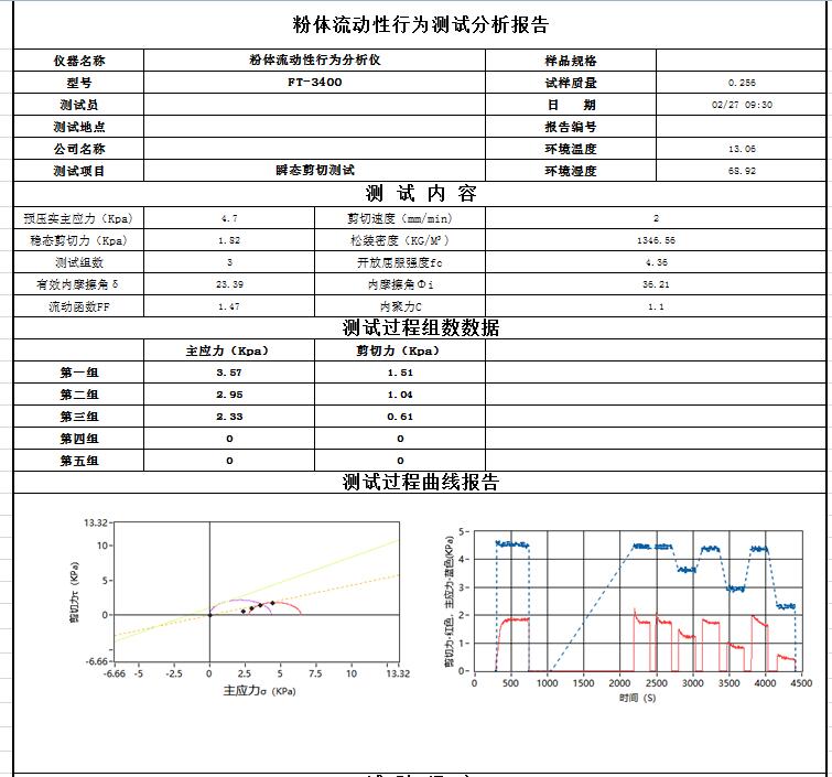 分析和測試如下數據:莫爾應力圓、內摩擦角、主應力、剪切力、屈服軌跡、穩態流、流動函數、開放屈服強度(無側限屈服強度)、內摩擦時間角、時效屈服軌跡、堆積密度、密度軌跡、壁摩擦角、附著力、壁剪切力、壁應力、壁軌跡、運動摩擦角、靜態摩擦角、料倉設計的料斗半頂角、卸料口徑、流與不流判定、流動因子、初始抗剪強度(內聚力)等數據分析.