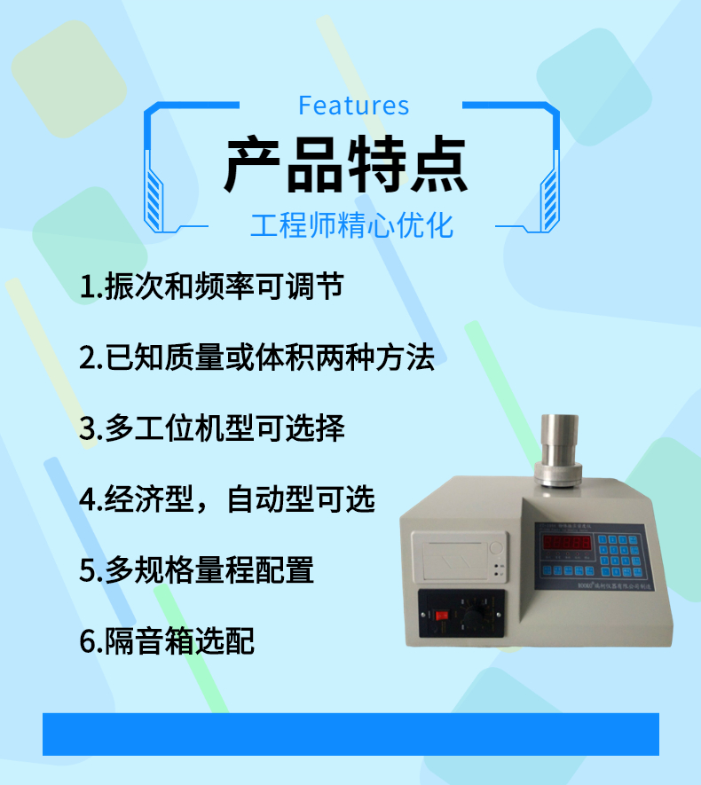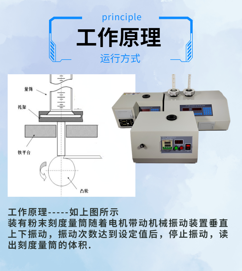 對粉末和顆粒振實密度、松裝密度、堆積密度、安息角(休止角)、質量流速、體積流速項目測量,綜合反映粉體流動性和表征特性狀況,通過卡爾指數,豪斯納比指數綜合評定物料流動性狀況.