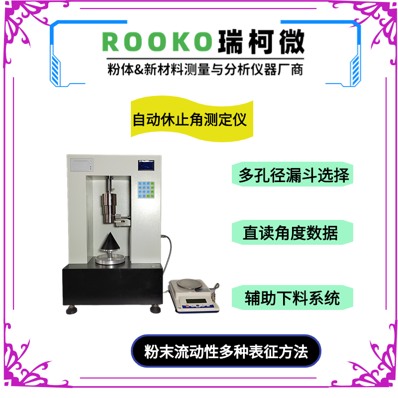 測試粉末和顆粒通過漏斗的時間和形成的角度,測試前進行預堆積,從而已知樣品量,將已知質量粉末從漏斗流出而形成的堆積角,以及流出所需要的時間;可以獲得休止角和流速數據。