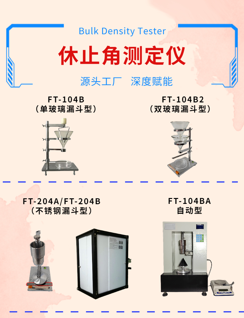 測試粉末和顆粒通過漏斗的時間和形成的角度,測試前進行預堆積,從而已知樣品量,將已知質(zhì)量粉末從漏斗流出而形成的堆積角,以及流出所需要的時間;可以獲得休止角和流速數(shù)據(jù)。