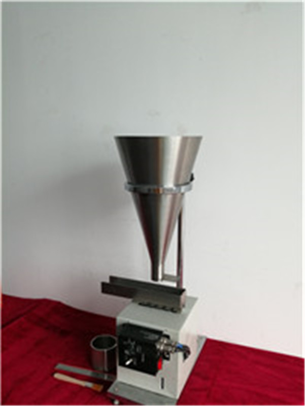 工作原理:將待測的微粉裝入漏斗,微粉在自身的堆積作用下處于堆積狀態。當電磁振蕩器啟動后,微粉在電磁振動的作用下,途徑流入測量桶中,將落入到測量筒中的微粉刮平,在天平上稱取刮平后測量筒中的微粉質量,再除以測量筒的容積,就可以測出待測微粉的堆積密度