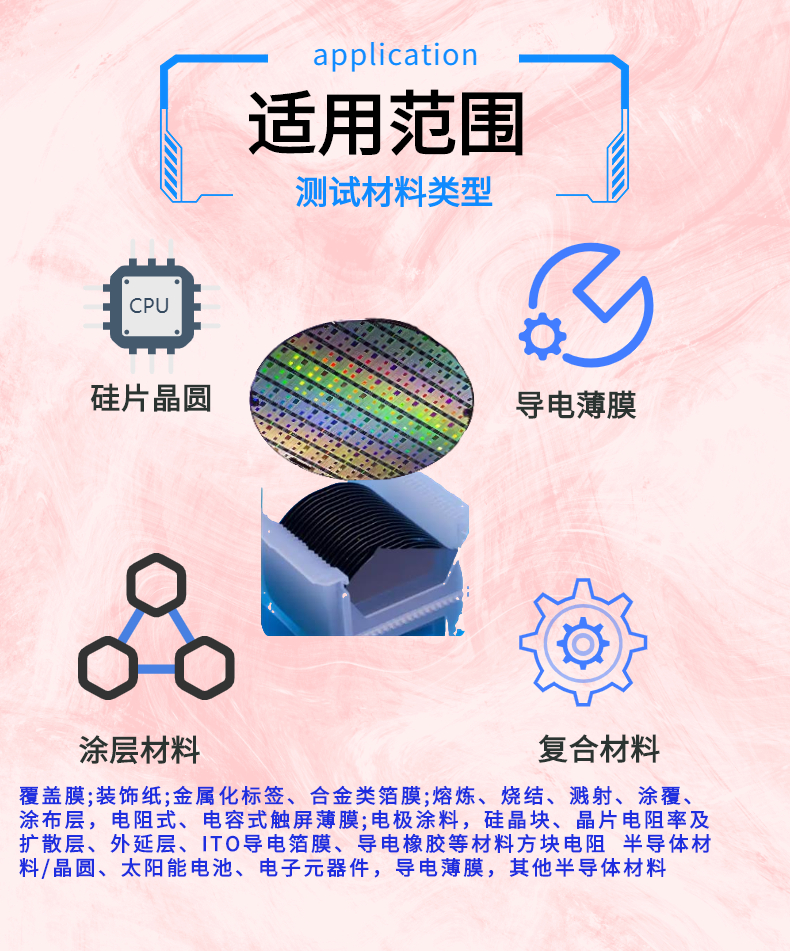 晶圓、非晶硅/微晶硅和導電膜電阻率測量;選擇性發射極擴散片;表面鈍化片;交叉指樣PN結擴散片;新型電極設計,如電鍍銅電阻測量等;半導體材料分析,鐵電材料,納米材料,太陽能電池,LCD,OLED,觸摸屏等.